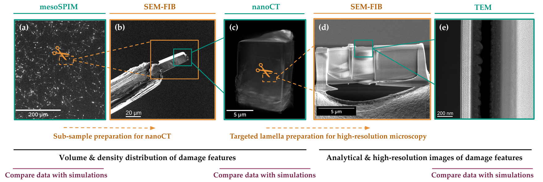 chain of microscopic investigations of a crystal sample Artificial and natural crystal detectors represent a novel method for detection of exotic and standard model particles. Nuclear recoils, with energies as low as tens of electronvolt. of particles off crystal’s atoms can produce persistent damage features in the crystalline structure (“tracks”). These tracks could be then imaged with modern high-resolution microscopy, thus allowing us to study the nature of the interacting particles. An exciting extension of the crystal detectors concept are the so-called “paleo-detectors”, where instead of synthetic crystals we could use natural crystals that can be excavated and imaged. Tracks from particle interactions that were accumulated in such ancient crystals over millions of years, may allow us to not only detect signatures left by particle dark matter, neutrinos and cosmic rays, but also to study their flux variations. Whether using crystals as “paleo-detectors” or as mundane real-time passive particle detectors, the key aspect of the detection technique revolves around the ability to identify, image and analyse nanometre-scale damage tracks. Taking advantage of KIT’s state-of-the-art microscopy facilities, the Dark Matter group at KIT-IAP is performing a wide range of experimental studies towards the realization of the concept of crystal detectors.